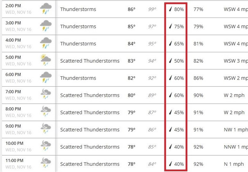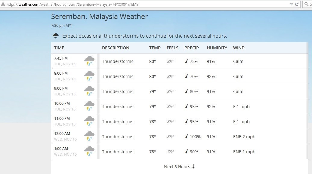 با توجه به پیشبینی سایت معتبر هواشناسی «Weather.com» هوای این منطقه از مالزی در ساعات آینده هم ناپایدار خواهد بود و بارندگی ادامه دارد که با این تفاسیر احتمالاً بازی به فردا موکول شود، البته ماجرا در اینجا ختم نمیشود چون شرایط آب و هوایی سرمبان فردا نیز تعریفی ندارد و شاید این دیدار بهکلی لغو و برگزاری آن به تاریخی دیگر موکول شود، با این حال باید منتظر نظر داور بازی بود.