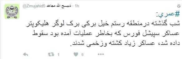 به گزارش دفتر منطقهای خبرگزاری تسنیم، «ذبیحالله مجاهد» سخنگوی طالبان افغان، در صفحه شخصی خود در توئیتر مدعی شد که یک بالگرد نیروهای ویژه افغانستان که برای عملیات در شهرستان «برکی برک» ولایت لوگر آمده بود را در منطقه «رستم خیل» این شهرستان هدف قرار دادهاند.