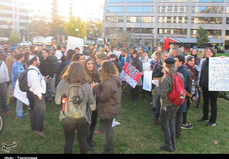 دها تن از یهودیان آمریکا با تجمع در مقابل کاخ سفید علیه «استیفن بنون» مشاور ارشد ترامپ و افکار نژادپرستانه وی درباره یهودیان و مسلمانان دست به تظاهرات زدند.