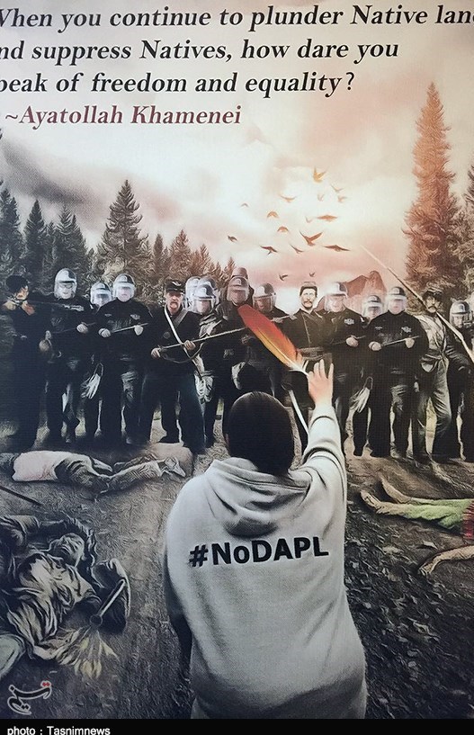 مضمون این نوشته این است: «هنگامی که شما به تاراج سرزمینهای بومی ادامه داده و بومیان را سرکوب میکنید چگونه به خود جرأت میدهید که از آزادی و برابری صحبت کنید. آیتالله خامنهای».