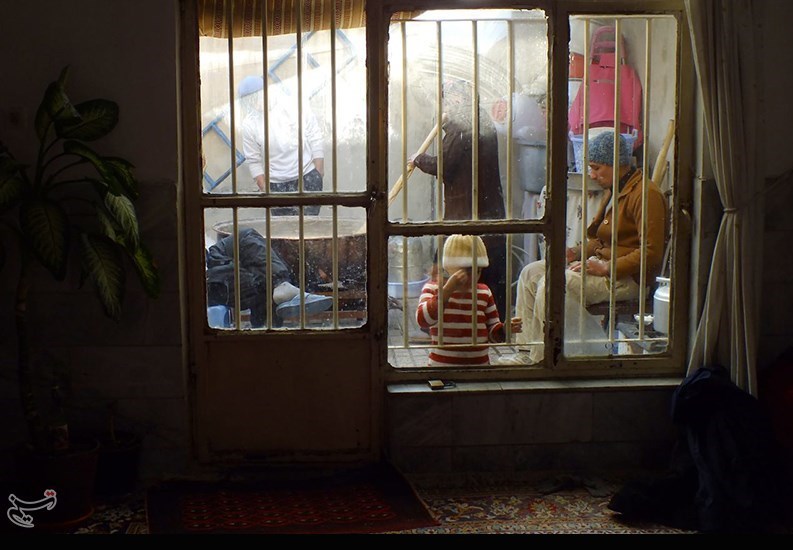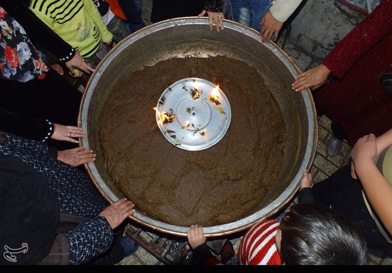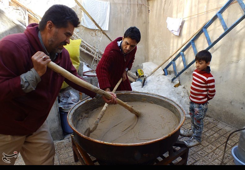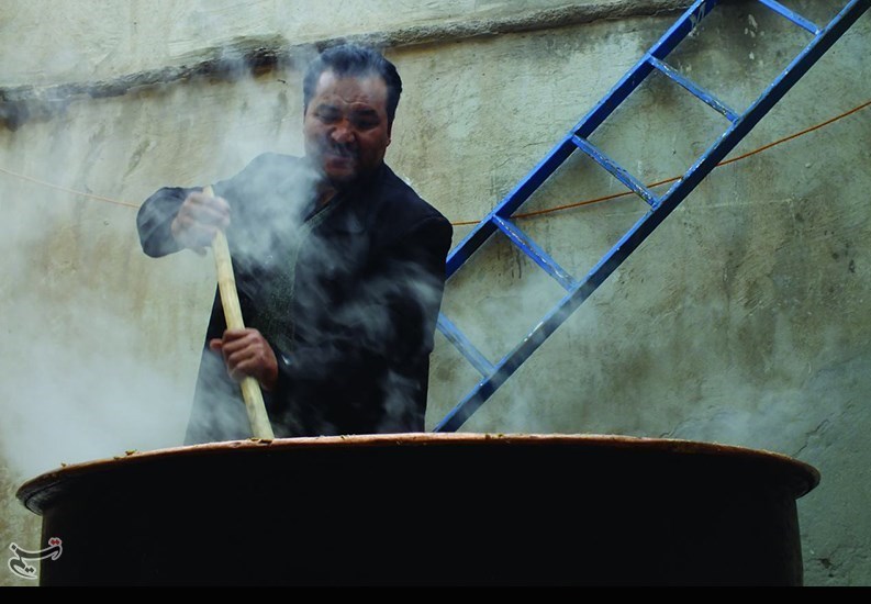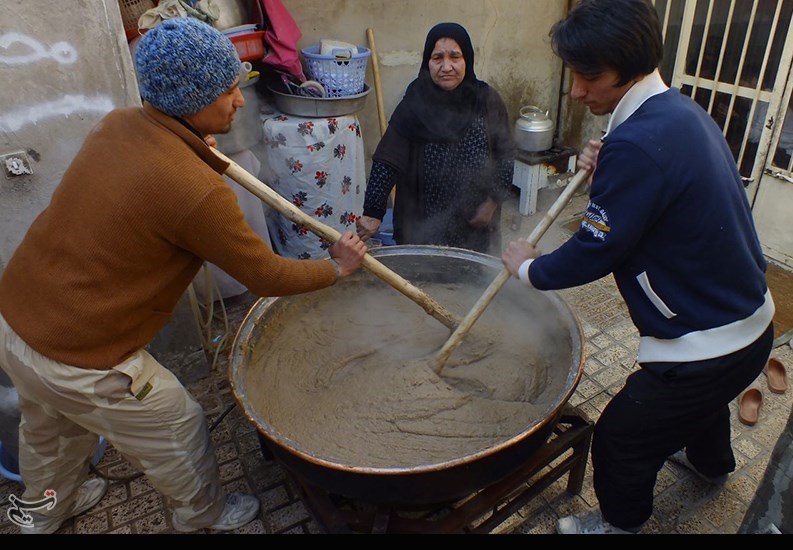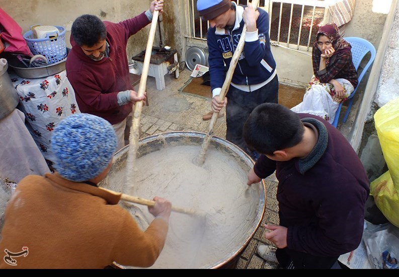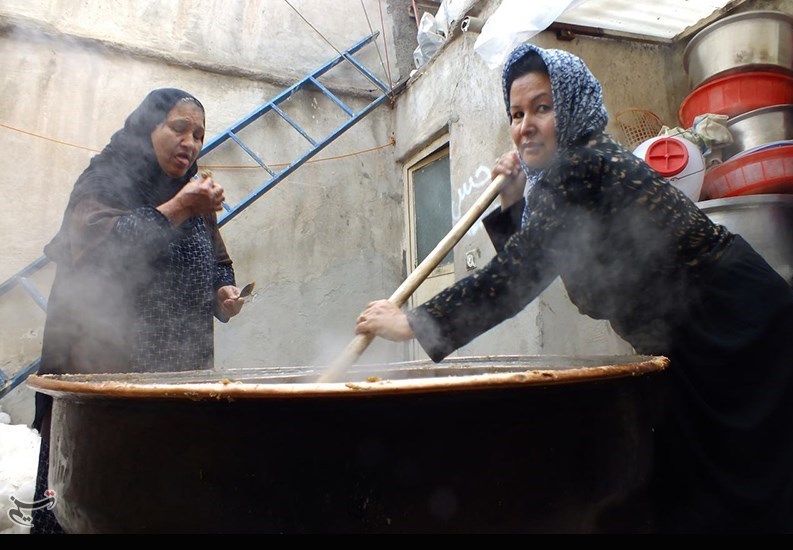 در وسط صحن حیاط دیگ مسی بزرگی خودنمایی میکند و چند مرد و زن که معلوم است ساعتها پای این دیگ حلوا را هم زدهاند تا ته نگیرد.