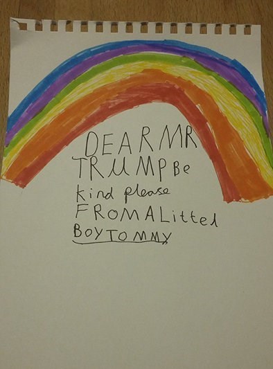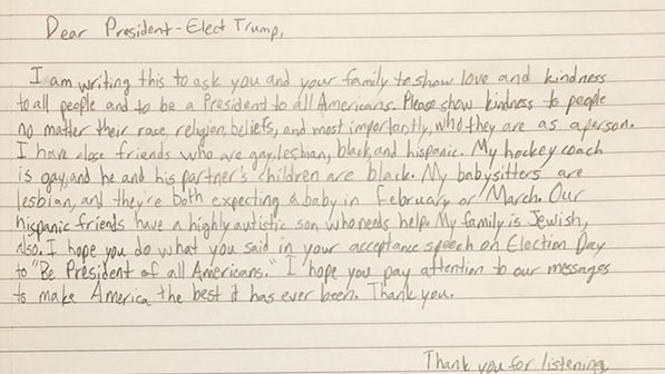 نامههای کوتاه یا همراه با نقاشی زیادی به این کمپین ارسال شده است؛ مثلاً پسربچهای به اسم «تام» فقط در نامهاش یک جمله نوشته است. «آقای ترامپ عزیز لطفاً مهربان باش.» و در زیر این نامهاش یک رنگینکمان نقاشی کرده است. یک دختر ششساله هم در نامهاش به ترامپ از او خواسته تا او را بهعنوان مشاور خود انتخاب کند! «آقای رئیسجمهور لطفاً با چیزهای اطرافت مهربان باش و به آنها حرفی نزن که ناراحت بشوند. این باعث میشوند که من هم آرامش بیشتری داشته باشم. موفق باشی در شغل جدیدت. اگر کمک احتیاج داشتی، روی من حساب کن!» مادر این کودک ششساله میگوید پس از انتخابات و این نامهنگاری، دخترش علاقه بیشتری برای فعالیتهای اجتماعی دارد.