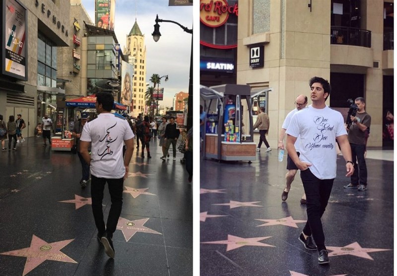 به گزارش خبرگزاری تسنیم، فرزاد فرزین، خواننده موسیقی پاپ کشورمان این روزها برای انجام چند پروژه کاری در امریکا به سر میبرد. او با حضور در هالیوود و پوشیدنِ پیراهنی با طرح «خدا یکی وطن یکی» در پیادهروهای هالیوود قدم زد تا حرف خود را به شیوهای متفاوت بیان کند.