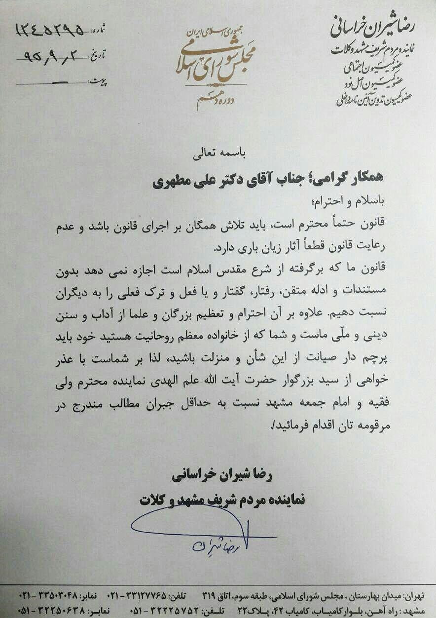 به گزارش خبرگزاری تسنیم از مشهد مقدس، رضا شیران خراسانی نماینده مردم مشهد مقدس در مجلس شورای اسلامی با انتشار نامهای خواستار عذرخواهی علی مطهری از آیت الله علم الهدی، نماینده ولی فقیه در استان خراسان رضوی شده است.