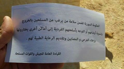 به گزارش خبرنگار خبرگزاری تسنیم در سوریه، فرماندهی ارتش سوریه به منظور حفظ سلامت شهروندان سوری بار دیگر از عناصر مسلح مستقر در مناطق شرقی حلب خواستار خروج و یا تسلیم آنها شد. هواپیماهای نظامی ارتش سوریه نیز اعلامیههایی را درباره خروج عناصر مسلح در شرق حلب و یا تسلیم آنها همراه با تحویل سلاح، پخش کردند.