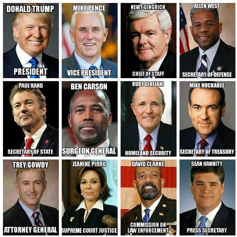 وی تا کنون دو وزیر از 15 وزیر خود را که به تایید نهایی توسط سنای آمریکا نیز نیاز دارند انتخاب کرده است.