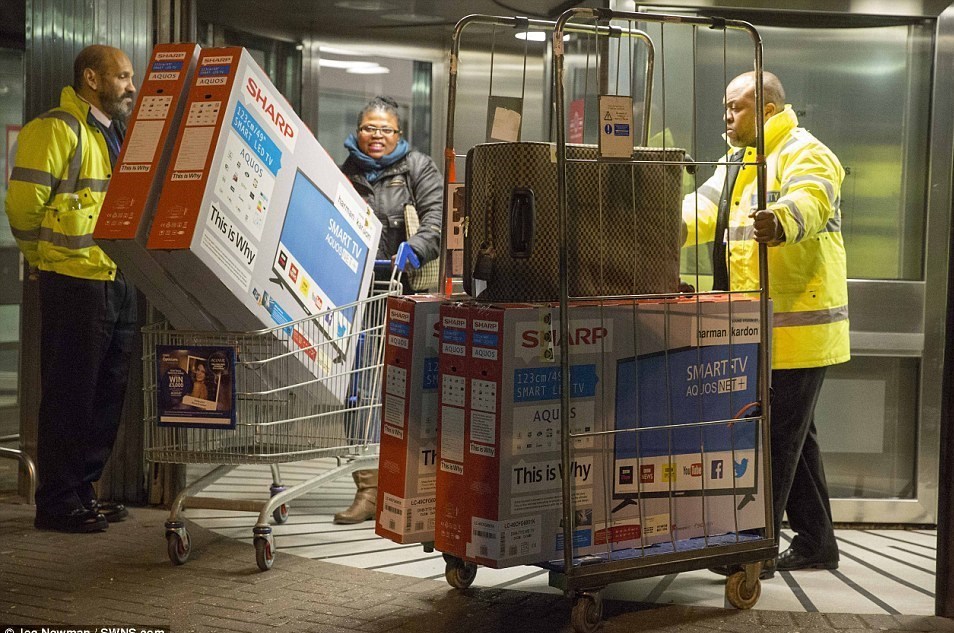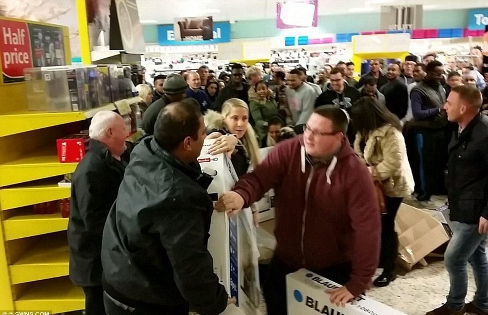 درگیری بعد از آن آغاز شد که مردم بر سر دستکاه DVD و سیستم بازی که تخفیف بیشتری داشت باهم گلاویز شدند.