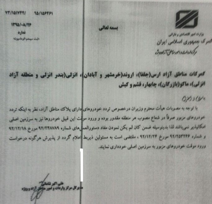 این بخشنامه به گمرکات مناطق آزاد ارس، اروند، انزلی، چابهار، قشم و کیش ابلاغ شده است و بر اساس آن دستور العملهای پیشین که ورود موقت خودروهای پلاک منطقه آزاد به سرزمین اصلی را مجاز میدانست، ملغی شد.