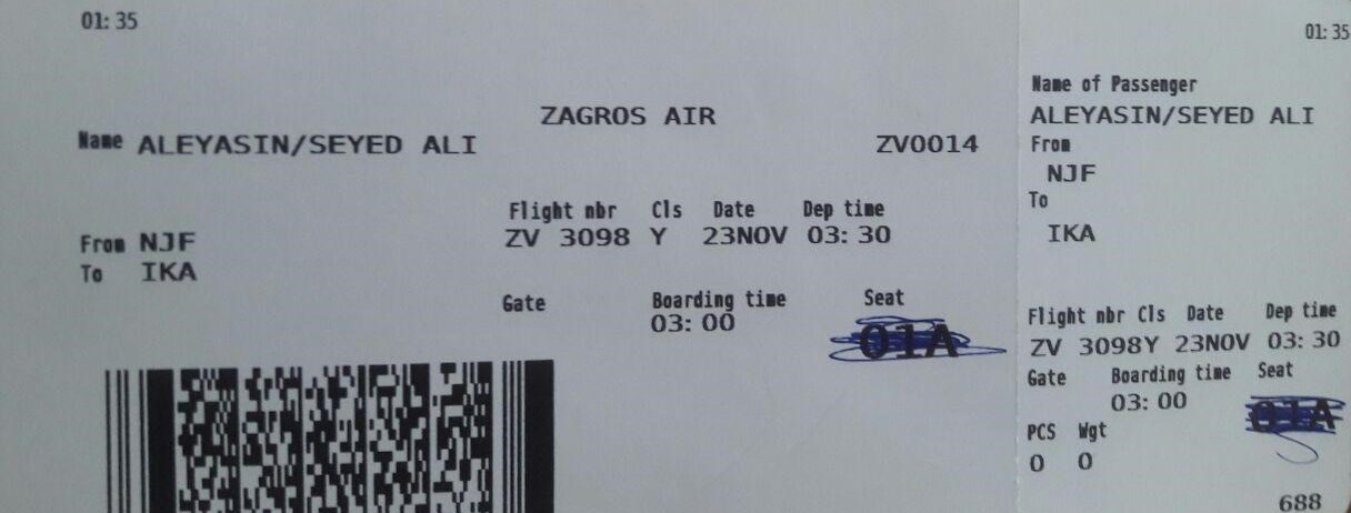مسئول کاروان ایرانی گفت: اما هنگام سوار شدن به هواپیما، متصدی شرکت هواپیمایی زاگرس در فرودگاه نجف مانع سوارشدن این خردسال شد و گفت که نام وی در لیست مسافران این پرواز نیامده است. این در حالی بود که بلیت تمامی 120 نفر در این کاروان رفت و برگشت بوده و چطور ممکن است که نام یک نفر در لیست پرواز رفت بوده باشد ولی در لیست پرواز برگشت نباشد، ضمن اینکه ما بلیت این خردسال را هم داشتیم و به متصدی شرکت هواپیمایی زاگرس نشان دادیم که وی با کمال تعجب گفت، "برای من بلیت مهم نیست، نام این خردسال در لیست این پرواز وجود ندارد."