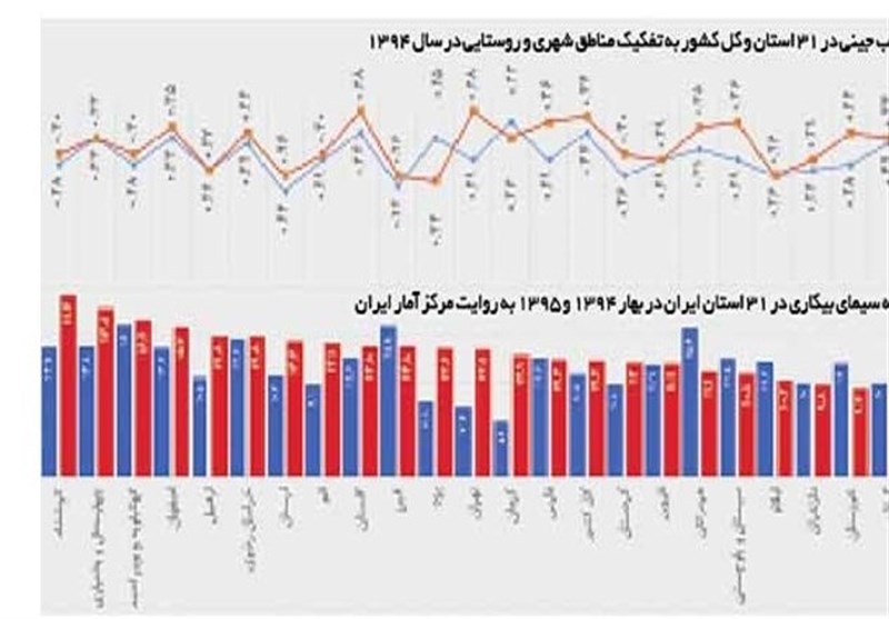 اطلاعات مرکز آمار ایران در زمینه ضریب جینی حاکی از آن است که در میان شهرها بیشترین نابرابری بهترتیب در استان تهران با ضریب جینی 0.38درصد، استان گلستان با ضریب جینی 0.38 درصد، استان فارس با ضریب جینی 0.36 درصد و استان اصفهان با ضریب جینی 0.39 درصد است. همچنین بیشترین نابرابریها در روستاها بهترتیب در استان کرمان با ضریب جینی 0.36 درصد، گلستان 0.34 درصد و آذربایجانشرقی و مرکزی با ضریب جینی 0.34 درصد است. همچنین کمترین نابرابریها در شهرهای استان یزد با ضریب جینی 0.25درصد، البرز، آذربایجان غربی، لرستان و ایلام 0.26 درصد محقق شده است. کمترین نابرابری در روستاهای استان خراسان جنوبی و البرز با ضریب جینی 0.24درصد، زنجان و آذربایجان غربی با ضریب جینی 0.25 درصد و ایلام و کردستان 0.26 درصد است.