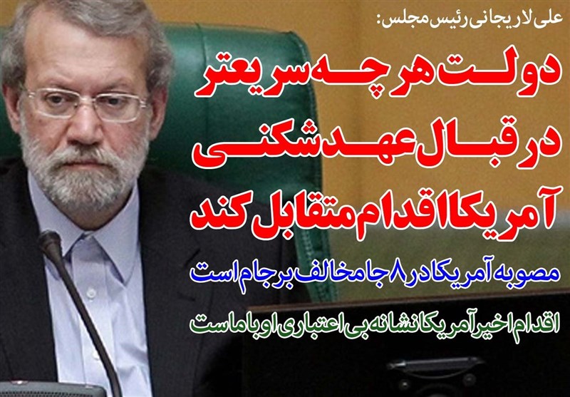 رئیس مجلس گفت:دولت باید متناسب با مصوبه مجلس در قبال عهدشکنی آمریکا هرچه سریعتر اقدام متقابل را انجام داده و گزارش آن را به مجلس ارائه دهد.