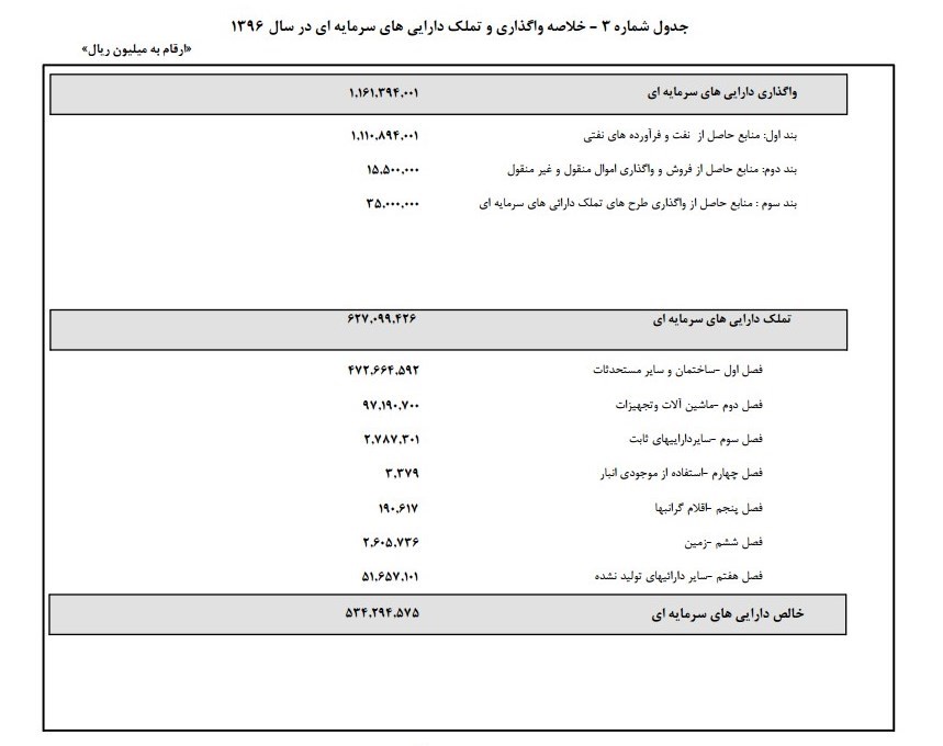 بر مبنای جدول شماره سه لایحه بودجه سال 96، که به موضوع تملک و واگذاری داراییهای سرمایه ای میپردازد، منابع حاصل از فروش نفت و فراورده های نفتی 111هزار میلیارد تومان در نظر گرفته شده است. همچنین منابع حاصل از فروش اموال منقول و غیر منقول هزار و 550میلیارد تومان پیش بینی شده است. همچنین کل درآمدهای حاصل از واگذاری داراییهای سرمایه ای 116هزار میلیارد تومان عنوان شده است. بر اساس این جدول منابع حاصل از تملک دارایی های سرمایه ای 62هزار میلیارد تومان می باشد.
