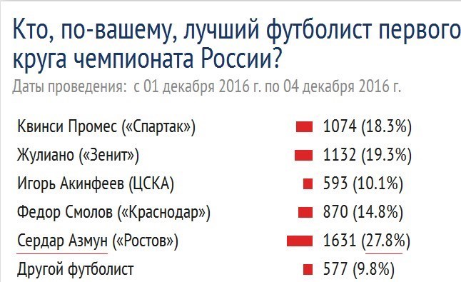 یولیانو، پرومس، اسمولوف و آکینفیف رتبههای دوم تا پنجم نظرسنجی روزنامه روسی را به دست آوردند. گزینه بازیکنان دیگر هم با آرای 9.8 درصدی مواجه شد.