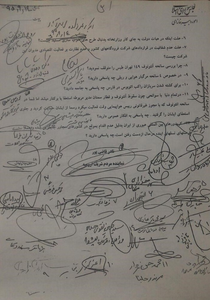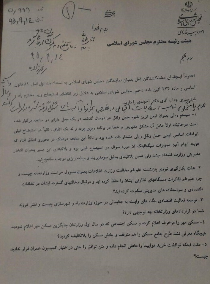 احتراما اینجانبان امضاءکنندگان ذیل به عنوان نمایندگان مجلس شورای اسلامی به استناد بند اول اصل 89 قانون اساسی و ماده 222 آییننامه داخلی مجلس به دلایل ذیر تقاضای استیضاح وزیر محترم راه و شهرسازی جناب آقای دکتر آخوندی را داریم.