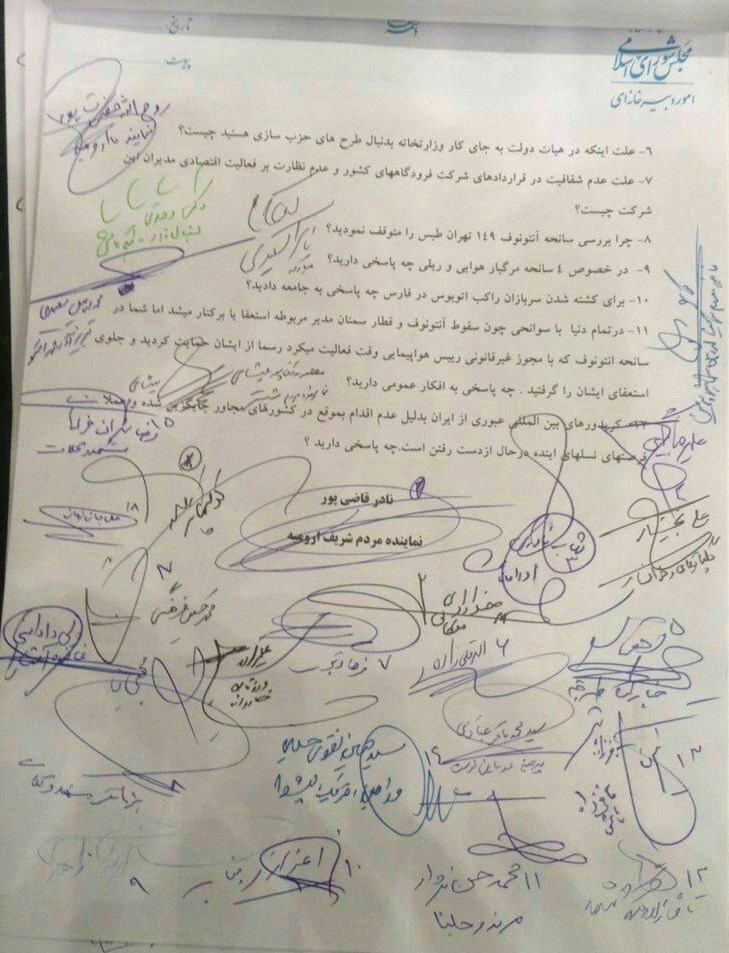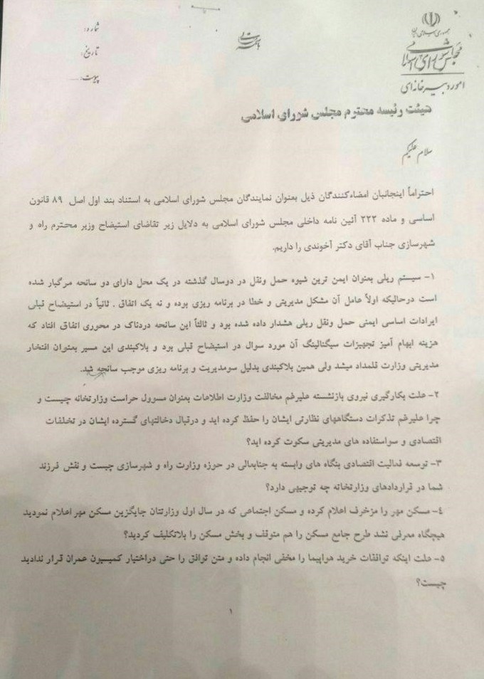 وی با بیان اینکه در نامه استیضاح آخوندی تعداد 12 بند تخلف و ضعفهای وزیر راه و شهرسازی در مدیریت و حوادث مربوط به حادثه قطار تبریز – مشهد اشاره شده است، افزود: عدم شفافیت در خرید هواپیما و بدون اطلاع مجلس، توسعه بنگاههای اقتصادی مربوط به آخوندی و فرزند وی در حوزه وزارتخانه، بکارگیری نیروهای بازنشسته در پستهای کلیدی وزارتخانه، حوادث متعدد مرگبار ریلی - جاده و هوایی در کشور از جمله مهمترین سرفصلهای نمایندگان برای استیضاح وزیر راه است.