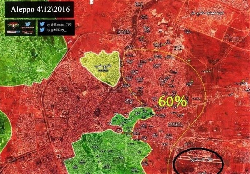 ارتش سوریه روز گذشته محلههای کرم الطراب، القاطرجی، کرم الجزماتی و المیسر و میدان الشعار را از لوث تروریستهای تکفیری پاکسازی کرد که با این موفقیتها بیش از 60 درصد شرق حلب را از اشغال آنها آزاد کرده است.