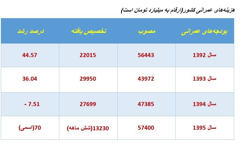 از سوی دیگر در حالیکه دولت برای پرداختهای جاری مُرّ قانون را رعایت کرده و از قانون بودجه تخطی نمیکند، حتی گاهی بیش از مبلغ مصوب هزینههای جاری داشته و به ندرت کمتر از میزان مصوب تخصیص داده است، اما در هزینههای عمرانی عملکرد خوبی ندارد و تنها 45 درصد از اعتبارات مصوب را تخصیص داده است. کارشناسان معتقدند که این تخصیص 45 درصدی به اندازه 45 درصد هم در اقتصاد تاثیر نداشته و توسط مدیرانی هزینه میشود که هزینههای جاری کشور را وارد رکوردهای تاریخی کرده و نتوانستهاند با بهرهوری مناسب از هزینهها بکاهند. به عبارت سادهتر این هزینهها نیز در ساختار مبتنی بر ریخت و پاش ریخته شده است که رکود بیسابقه کنونی نشاندهنده تایید این تحلیل است.