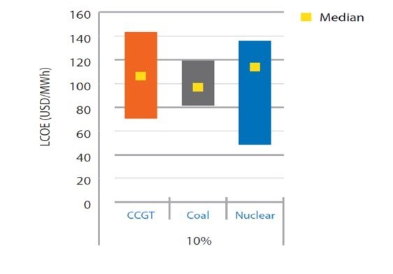 در این شکل، قیمتهای تمام شده برق تولیدی از سه نوع نیروگاه مختلف هستهای، زغالسوز و سیکل ترکیبی واقع در نقاط مختلف دنیا با یکدیگر مقایسه شده است. این شکل نشان میدهد هزینه همترازشده برق تولیدی در نرخ تنزیل 10 درصد برای نیروگاههای هستهای دارای بیشترین پراکندگی و برای نیروگاههای زغالسوز دارای کمترین پراکندگی قیمت است. همچنین با توجه به محل میانه این توزیع (نشاندهنده قیمت وسط در توزیع قیمتی)، میتوان نتیجه گرفت نیروگاههای زغالسوز به طور معمول ارزانترین برق در بین این سه نوع نیروگاه در جهان را تولید میکنند.
