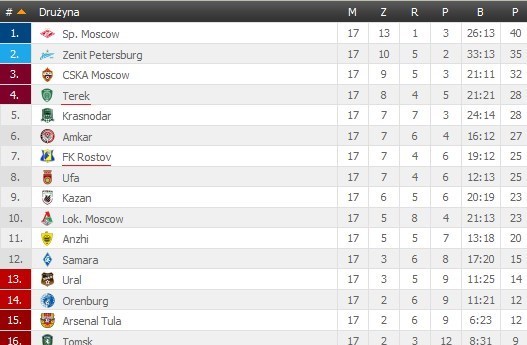 تیم اسپارتاک مسکو با ماسیمو کاررا، سرمربی ایتالیایی فصل جدید لیگ برتر روسیه را طوفانی آغاز کرد و با 40 امتیاز صدرنشین نیم‌فصل اول این رقابت‌ها شد. زنیت سن پترزبورگ دیگر تیم مدعی و متمول لیگ برتر روسیه با 35 امتیاز جایگاه دومی را از آن خود کرد  و زسکا مسکو، مدافع عنوان قهرمانی با 32 امتیاز رتبه سوم جدول رده‌بندی را در اختیار دارد. تیم‌های ترک گروژنی و کراسنودار نیز با امتیاز مشابه 28 در رده‌های چهارم و پنجم قرار گرفتند. تیم‌های اورال، اورنبورگ، آرسنال و تومسک هم در انتهای جدول رده‌بندی جای دارند.