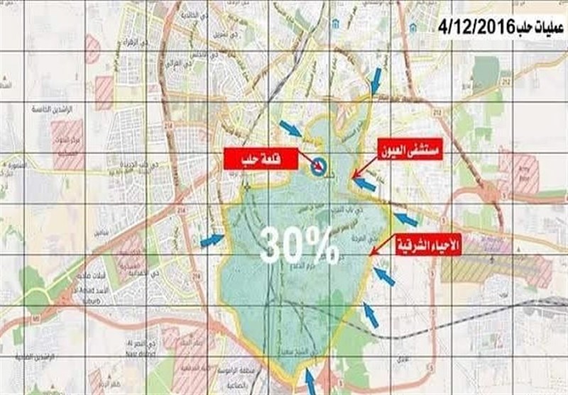فاصله نیروهای ارتش سوریه در داخل قلعه حلب از نیروهای پیشروی ارتش از سمت بیمارستان چشم از 600 متر فراتر نمیرود و در صورتی که ارتش بتواند این مسافت را طی کند، تروریستها را در داخل محله الشعار و کرم الجبل و محلههای اطراف و نیز در بخش قدیمی محاصره خواهد کرد.