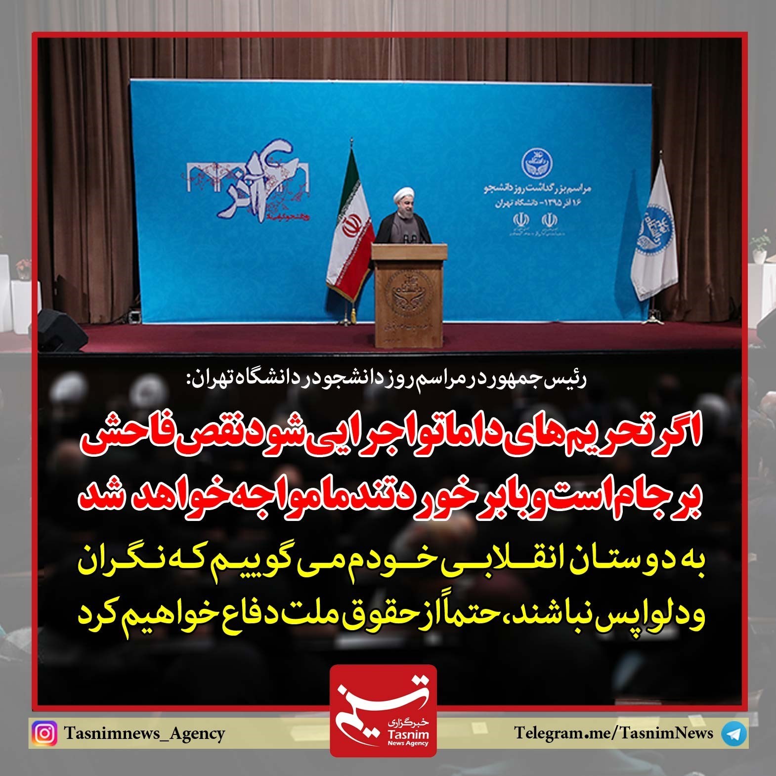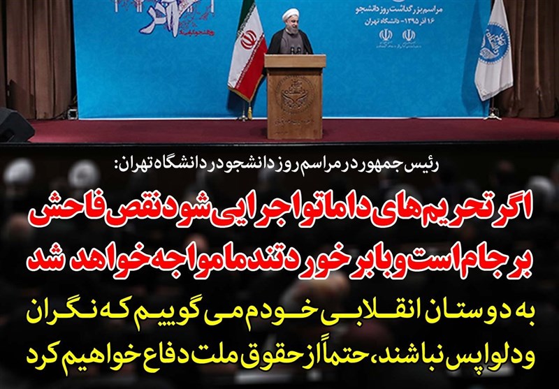 رئیس‌جمهوری اسلامی ایران گفت: بسیار خوشحالم که برای چهارمین بار خداوند به من توفیق داد تا در روز 16 آذر روز دانشجو و روز دانشگاه در بین دانشجویان باشم.