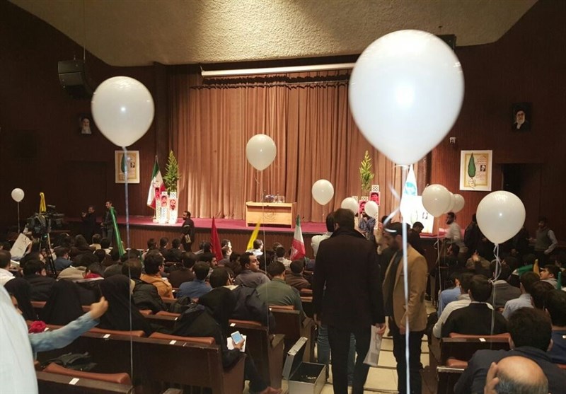 بخشی از فضای بین حاضران به وسیله بادکنک‌های سفید تزئین شده است. تعدادی از دانشجویان نیز با در دست داشتن پلاکارد و دست‌نوشته‌هایی درباره مسائل روز موضع‌گیری و طرح سؤال کرده‌اند.