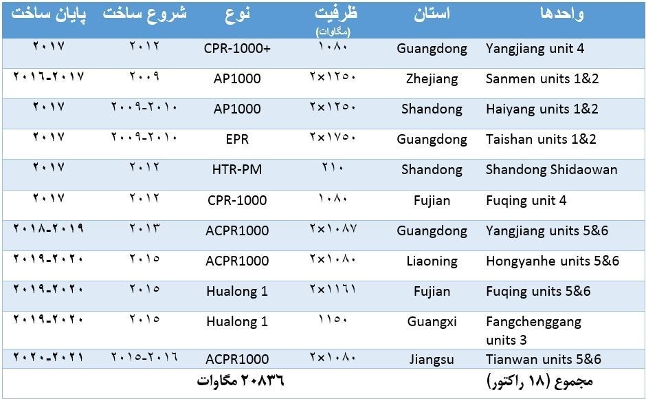 • چین دارای 35 راکتور عملیاتی و 18 راکتور در حال ساخت بوده و تعداد دیگری نیز در مرحله برنامه‌ریزی قرار دارند.