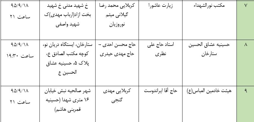جدول برنامه هیئتهای مذهبی در ذیل آمده است: