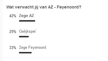 آلکمار نیز از آرای 42 درصدی برای شکست دادن تیم قدرتمند فاینورد برخوردار شد و گزینه تساوی بازی این دو تیم رای 25 درصدی هواداران فوتبال هلند را به دست آورد. گزینه پیروزی فاینورد نیز برابر یاران جهانبخش نیز با آرای 33 درصدی مواجه شد.
