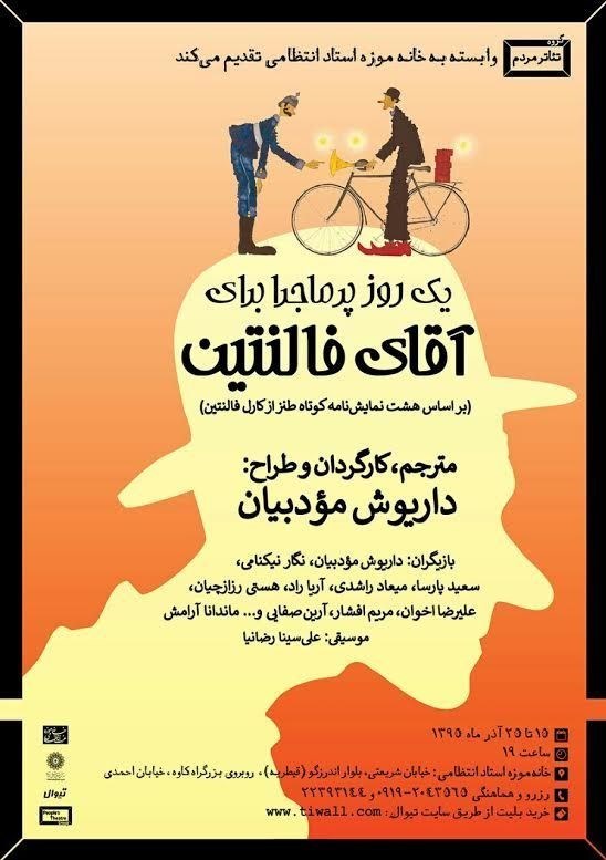 داریوش مؤدبیان که مدتهاست در تماشاخانه موزه انتظامی فعال است با نمایش «یک روز پرماجرا برای آقای فالنتین» به صحنه بازگشته است. این نمایش بر اساس هشت نمایشنامه کوتاه طنز از کارل فالتین است که توسط داریوش مؤدبیان ترجمه شده است.