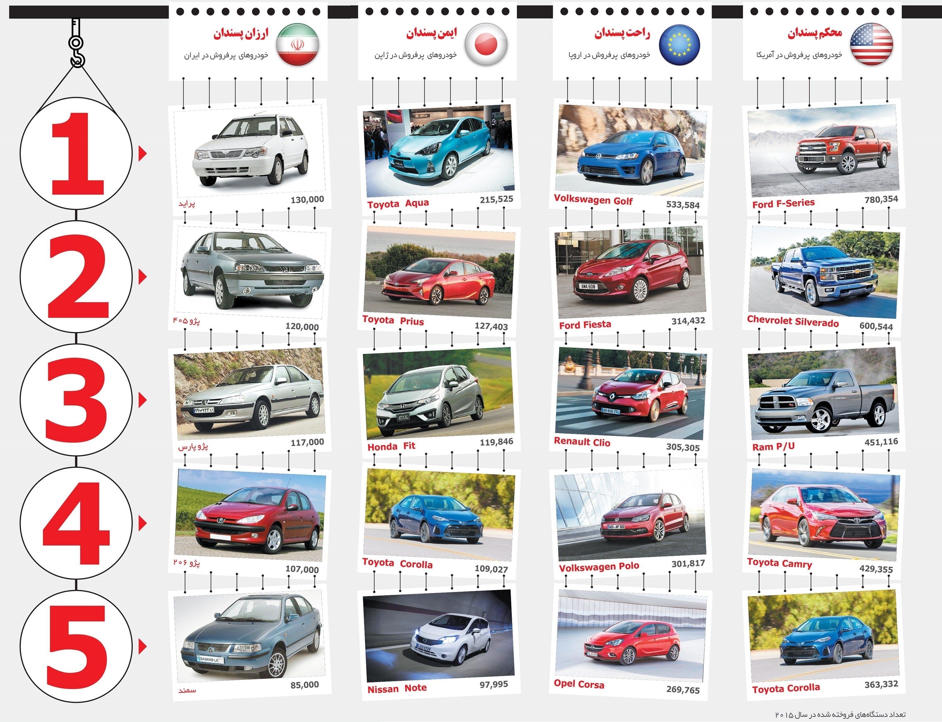 - بر اساس آمار خودروهای پر فروش ایران و جهان، میتوان نتیجه گرفت ایرانیها بر اساس میزان قیمت خودرو اقدام به خرید میکنند ولی به طور مثال در کشوری مانند ژاپن معیار خرید خودرو، ایمنی بالای آن است.