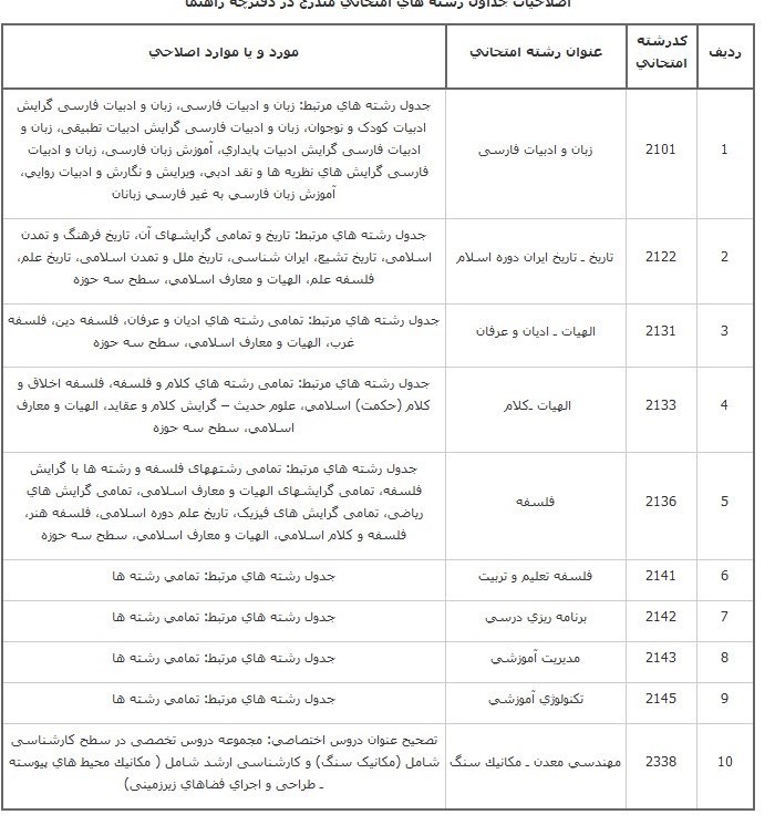 اصلاحات برخی رشتههای امتحانی در ذیل قابل مشاهده است: