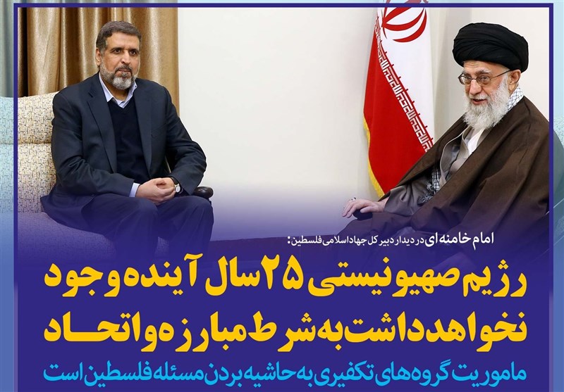 رهبر معظم انقلاب با تاکید بر اینکه مأموریت گروه‌های تکفیری به حاشیه بردن مسئله فلسطین است، گفتند: رژیم صهیونیستی به‌شرط مبارزه و اتحاد 25سال آینده وجود نخواهد داشت.