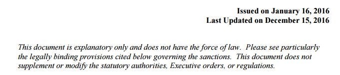 این سند که 16 ژانویه 2016 صادر شده بوده و امروز 15 دسامبر 2016 بروزرسانی شده است، توضیحی بوده و قانون جدید محسوب نمی شود. در ابتدای این سند آمده است: «این سند فقط توضیحی بوده و قانون محسوب نمیشود. لطفا مفاد الزامآور قانونی در خصوص تحریمها را که ذیلا ذکر شده است را ملاحظه کنید. این سند مکمل یا اصلاحیهای برای مقررات، فرمانهای اجرایی یا اختیارات قانونی نیست.»