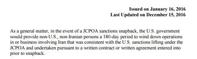 اما در صورت بازگشت تحریمها دولت آمریکا به اشخاص غیرآمریکایی و غیرایرانی 180 روز فرصت خواهد داد تا تجارت یا فعالیت با ایران را خاتمه دهند. البته در ادامه این سند توضیحات بیشتری در خصوص این شرایط ارائه شده است.