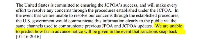 این سند در خصوص اینکه اگر اختلافات در چارچوب ساز و کارهای تعبیه شده حل نشوند و تحریمهای بازگردد، چگونه بازگشت تحریمها اعلام خواهد شد، اینگونه توضیح میدهد که دولت آمریکا این اطلاعات را صریحا از طریق مجاری اعلام خواهد کرد که سابقا از طریق آنها توافق موقت و توافق جامع اطلاعرسانی شدند. در این بخش همچنین آمده است: «ما نمیتوانیم پیش بینی کنیم که در صورت بازگشت تحریمها، چه مدت زمان قبل از آن اطلاعیه صادر خواهد شد.