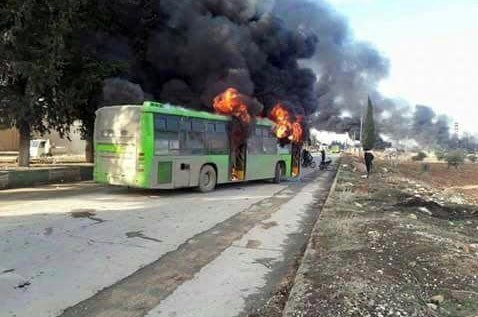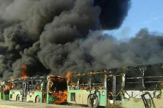 تروریستهای تکفیری تعدادی از اتوبوسهای اعزامی به کفریا و فوعه را به آتش کشیدند(تصاویر بالا)