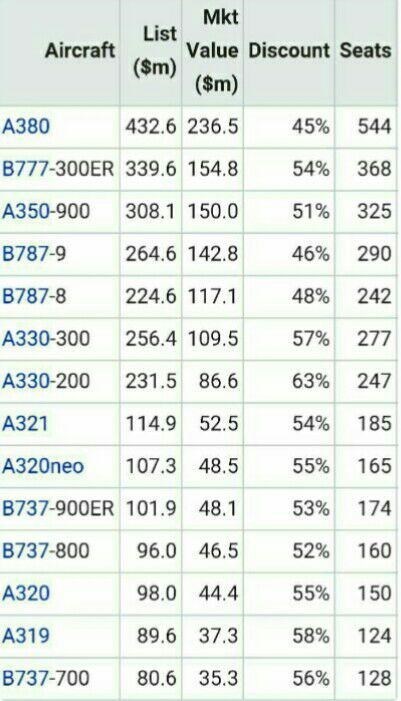 البته این حالت غالبا برای هواپیماهای برد متوسط به بالا محقق می شود و در هواپیماهای کوتاه برد و منطقه ای به دلیل تقاضای بیشتر ، نزدیک به قیمت ارائه شده کارخانه است که آن هم متوسط تا 30 درصد ممکن است تخفیف بخورد.