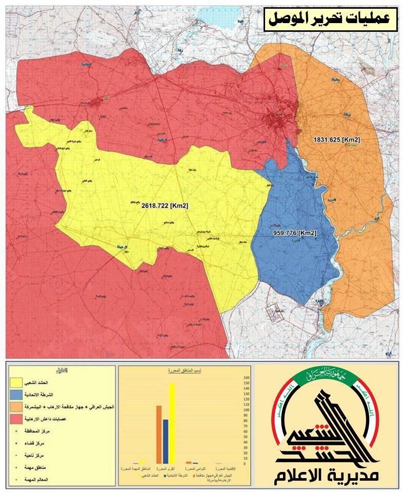 به گزارش گروه بین الملل خبرگزاری تسنیم، واحد رسانهای نیروهای داوطلب مردمی عراق حشد العشبی نقشهای را منتشر کرده که میزان پیشروی نیروهای عراقی را در محورهای مختلف عملیاتی در موصل نشان میدهد.