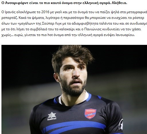 در ادامه خبر روزنامه ورزش یونان آمده است: قرارداد این بازیکن با پانیونیوس تابستان سال آینده به پایان میرسد و سران این باشگاه در خطر از دست دادن یورو خواهند بود. به همین خاطر انصاریفرد داغترین نام بازار نقل و انتقال ماه ژانویه فوتبال یونان است.