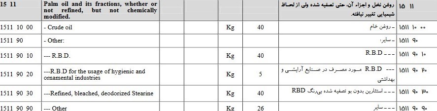 در جداول مقررات صادرات و واردات سال 95، ذیل فصل 15 مربوط به روغن، حقوق ورودی روغن نخل و اجزا آن ذکر شده است. همچنین در بند4 مندرجات ذیل یادداشت فصل 15 آمده است، حقوق ورودی دانه، روغن خام و روغن خام پالم (در صورت خرید دانههای روغنی داخلی به قیمت تضمینی با تایید وزارت جهاد کشاورزی از داخل) به ترتیب 5درصد، 11درصد و 26درصد میباشد.