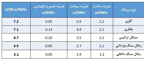 جدول 1 هزینه تمام شده برق تولیدی از نیروگاههای گازی، سیکل ترکیبی و زغال سوز
