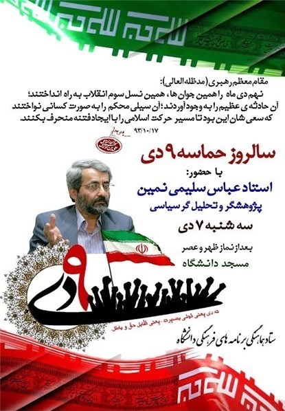 محمدحسن احمدی مسئول بسیج دانشگاه تربیت مدرس در گفتوگو با خبرنگار دانشگاه باشگاه خبرنگاران تسنیم«پویا»، از برگزاری همایش سالروز حماسه 9 دی با حضور عباس سلیمی نمین پژوهشگر و تحلیلگر سیاسی در روز سهشنبه(7 دیماه) بعد از نماز ظهر و عصر در مسجد دانشگاه تربیت مدرس برگزار میشود.