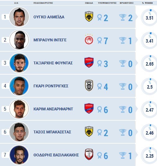به گزارش خبرگزاری تسنیم، در رده‌بندی برترین های نیم فصل اول سوپر لیگ فوتبال یونان هوگو آلمیدا، مهاجم پرتغالی تیم آ اک آتن جایگاه نخست را با کسب امتیاز 3.51 به دست آورد. براون ایدیه (المپیاکوس)، تاکسیاس فونتاس (پانیونیوس) و گری رودریگز (پائوک) در رده‌های دوم تا چهارم قرار گرفتند.