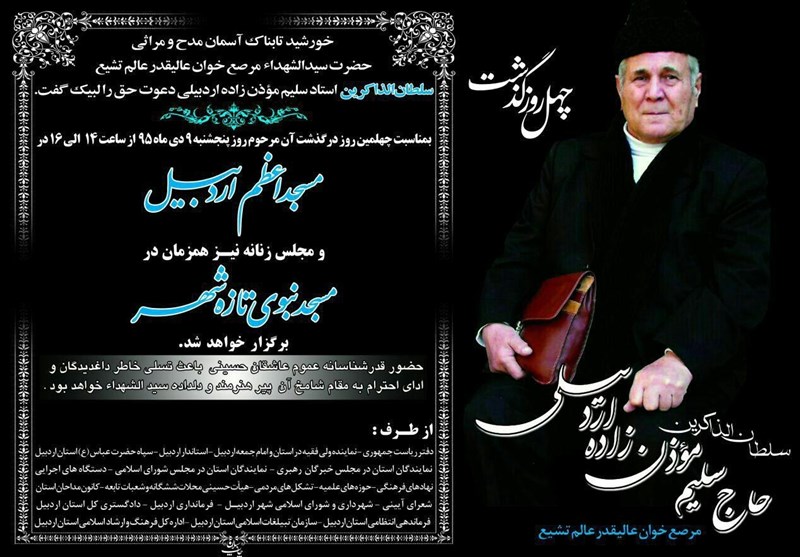 فرزند مرحوم استاد سلیم موذنزاده اردبیلی نیز ضمن تشکر و قدردانی از اقشار مختلف استان اردبیل کشور و میهمان داخلی و خارجی در این مراسم بیان کرد: مراسم چهلمین روز درگذشت استاد سلیم موذن زاده اردبیلی به صورت باشکوه برگزار شده و مردم دین خود را نسبت به اسطوره مداحی دنیا ادا کردهاند.