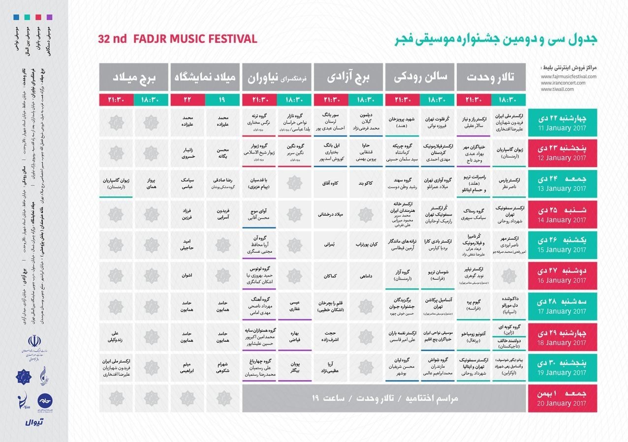 به گزارش خبرگزاری تسنیم، فروش اینترنتی بلیت اجراهای حاضر در سیودومین جشنوارهٔ موسیقی فجر از امروز شنبه 11 دی 1395 و از ساعت 14:00 آغاز و علاقمندان میتوانند از طریق دو سایت فروش بلیت به نشانی اینترنتیiranconcert. com و tiwall. com بلیتهای مورد نظر خود را تهیه کنند.