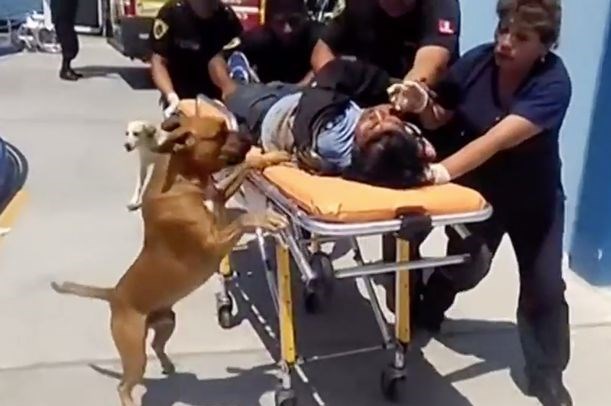 این دو سگ صاحبشان را از داخل آمبولانس تا داخل بیمارستان اسکورت کردند و یکی از آنها روی تخت و کنار صاحبشان و دیگری از پایین تخت وی را که روی تخت دراز شده بود و برای بستریشدن به داخل بخش منتقل میشد همراهی کردند.
