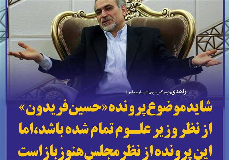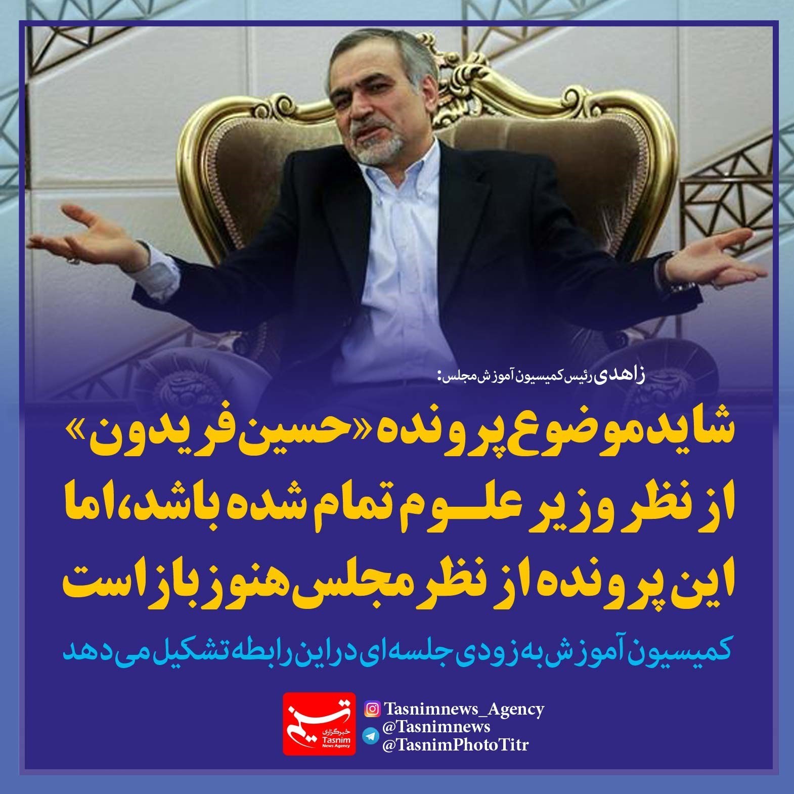 زاهدی با بیان اینکه هنوز پرونده تحصیلی «فریدون» در مجلس باز است، گفت: هیئت رئیسه مجلس ضمن ارجاع به کمیسیون آموزش با بررسی آن موافقت کرده است.