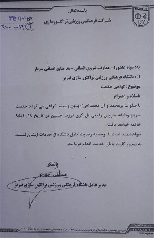 به گزارش خبرگزاری تسنیم، در این نامه که به امضای مدیرعامل باشگاه تراکتورسازی تبریز رسیده، رسماً خطاب به معاونت نیروی انسانی سپاه عاشورا اعلام شده است که خدمت سربازی سروش رفیعی در تاریخ 95/10/19 به اتمام میرسد و با توجه به رضایت باشگاه تراکتورسازی از این بازیکن نسبت به صدور کارت پایان خدمت وی اقدام شود.
