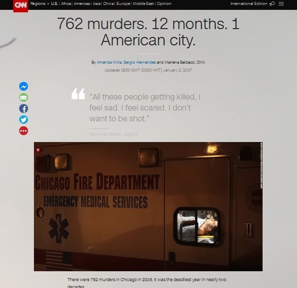 بر اساس گزارش CNN، بر اساس این آمار که طی دو دهه اخیر بیسابقه خوانده شده است،در سال 2016 ، 762 مورد قتل در این شهر رخ داده است که این میزان جنایت نسبت به سال 2015 که 667 مورد قتل گزارش شده بود افزایش قابلتوجهی(50 درصدی) نشان میدهد.